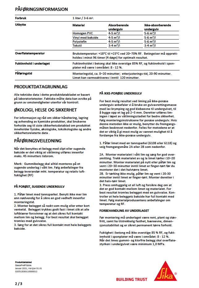 CascoProff Extra er et hurtigherdende lim med bra hugg. Til både våt- og heftliming. Gulvlim som kan benyttes til de fleste typer PVC-, LVT og tekstile gulvbelegg (tepper), klorfrie belegg med primet bakside, samt gummi-belegg inntil 4 mm tykkelse.